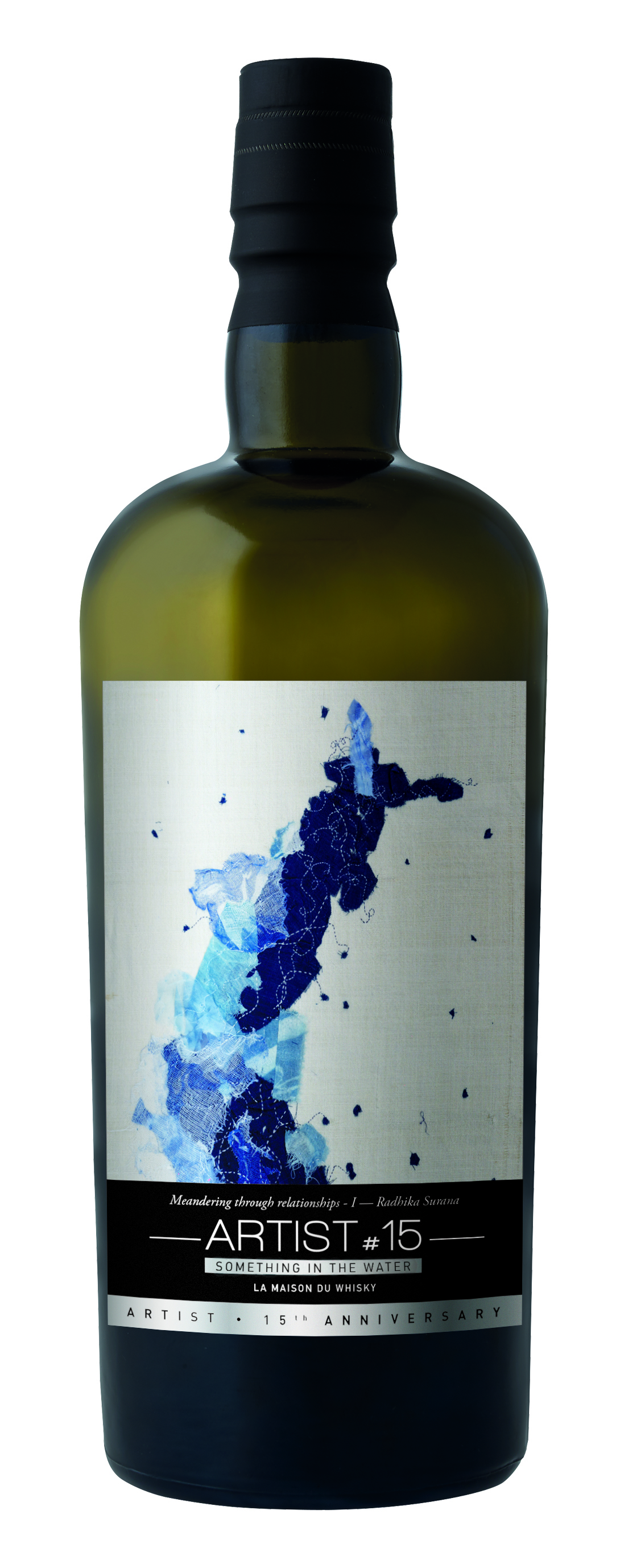 Exploring a comprehensive spectrum of peated profiles, Artist #15 features the evocative work of North Indian artist Radhika Surana. Her indigo-dyed textiles, adorned with meticulous embroidery, act as dreamlike cartography. Like abstract maps, her designs trace imaginary paths across Islay’s wild landscapes, mirroring the intricate and deeply layered whiskies within the bottles.